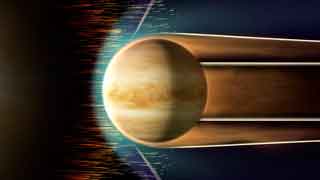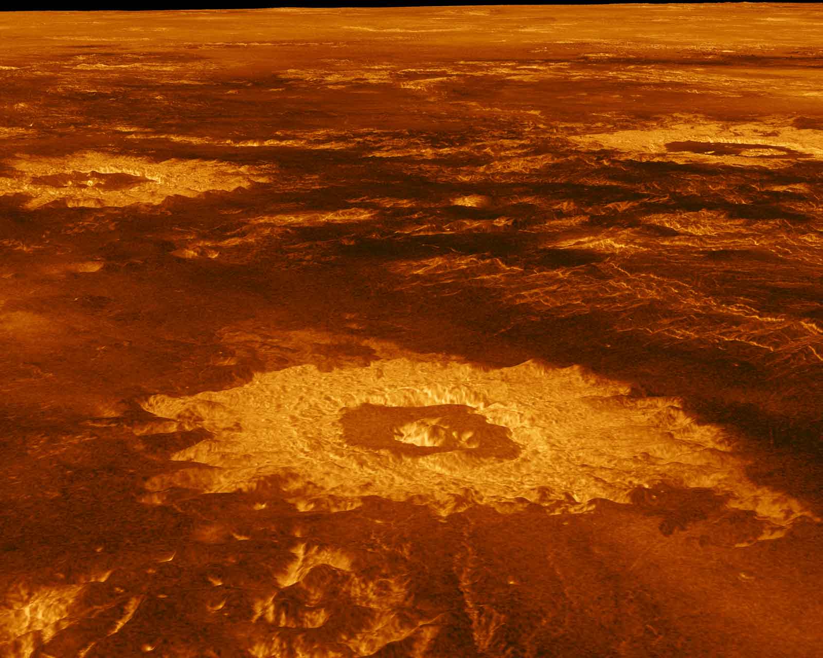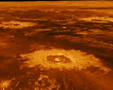 Sua composição atmosférica é constituÃda de Hélio, Sódio, Oxigênio, Dióxido de Carbono, Enxofre e vapor de água. A pressão atmosférica de Vênus é 92 vezes a da Terra. A temperatura é extremamente quente e espessa, capaz de derreter chumbo. O planeta foi mapeado pelo Programa Magellan nos anos de 1990 a 1994 e pelos estudos foi detectado extenso vulcanismo e enxofre na atmosfera, indicando erupções recentes. Vênus não possui crateras de impacto, demonstra jovialidade em sua superfÃcie, aparenta ter entre 300 â 600 milhões de anos. Ele também não possui placas Tectônicas.