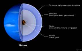 Conhecido como um gigante de gelo, Netuno apresenta uma atmosfera com extensa profundidade. Os cientistas apontaram a presença de Hidrogênio, Hélio, Deutério, Etano e Metano, esse último pode ser o responsável por sua coloração azul. Essa atmosfera profunda, funde-se gradualmente em água e gelo derretido até o núcleo; seu núcleo mais sólido e mais pesado tem aproximadamente o tamanho da Terra, contendo rocha e gelo.